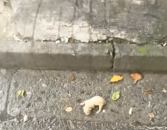 The newborn puppy was found lying alone on a sidewalk — weak, dirty, and barely breathing. His tiny body carried a sour smell of neglect, as if he had been left there for hours… maybe longer.