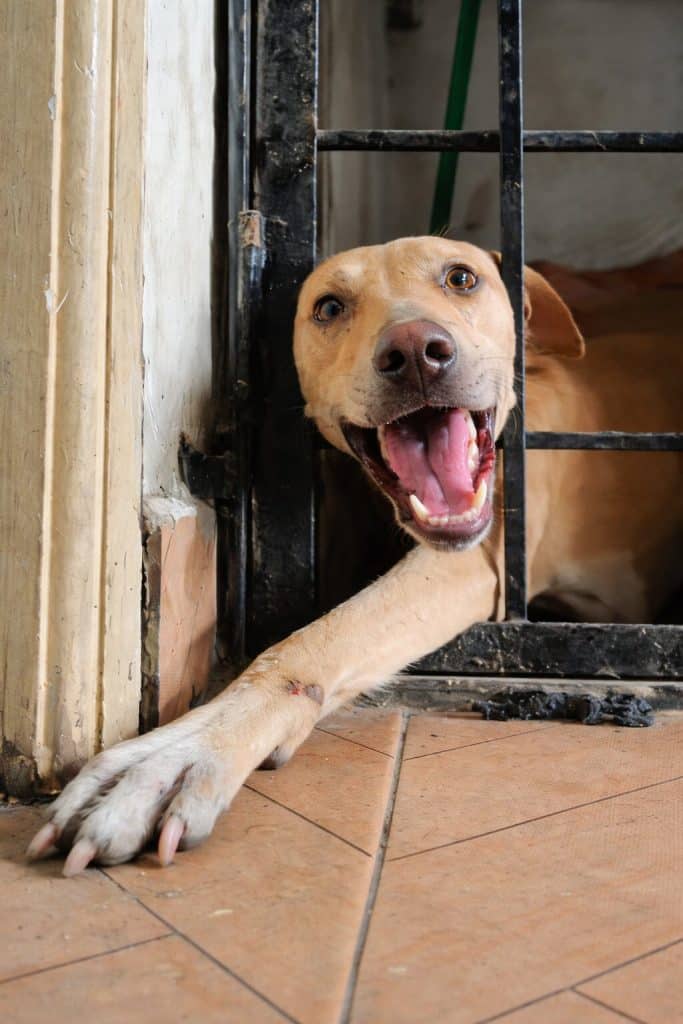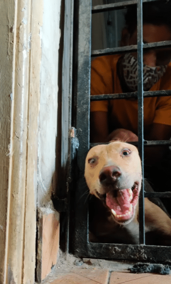 A light golden dog has her head stuck between the narrow bars of a metal gate. She struggles, panicked and confused, letting out sharp cries of distress. Every movement seems to tighten the trap around her neck.