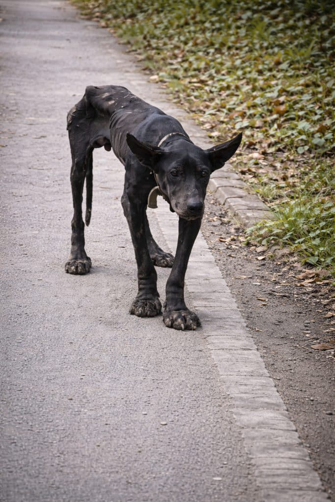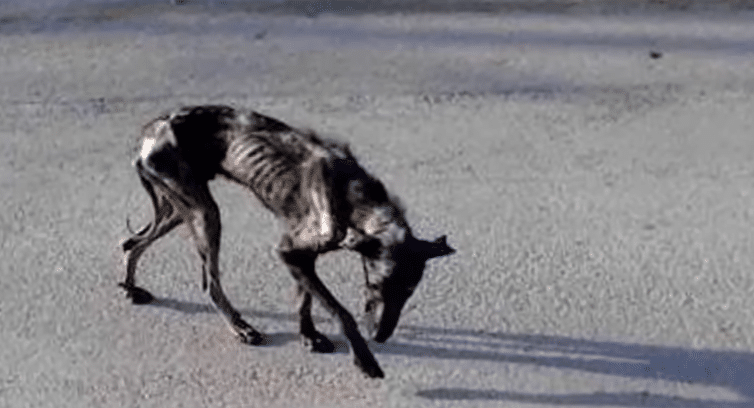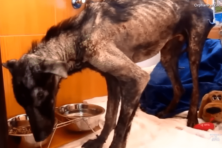 He was painfully thin — little more than skin stretched over bone. His body showed signs of severe mange, a contagious skin condition that had left his fur patchy and his skin irritated. He was so weak he could barely move.