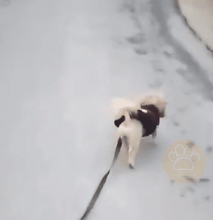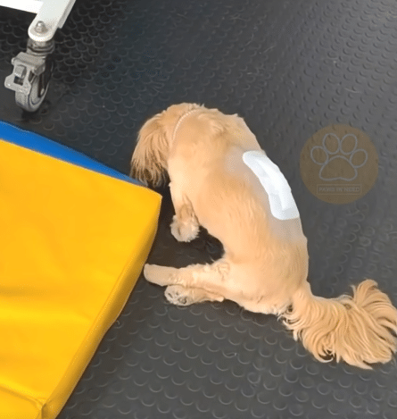 The footage captures the quiet determination of a small dog taking her first steps after surgery.