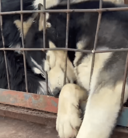 More than 30 dogs — Huskies, Golden Retrievers, Poodles, mixed breeds — were crammed inside. The space was so tight they could not turn around. Bodies pressed against bodies, stacked and tangled in exhaustion.