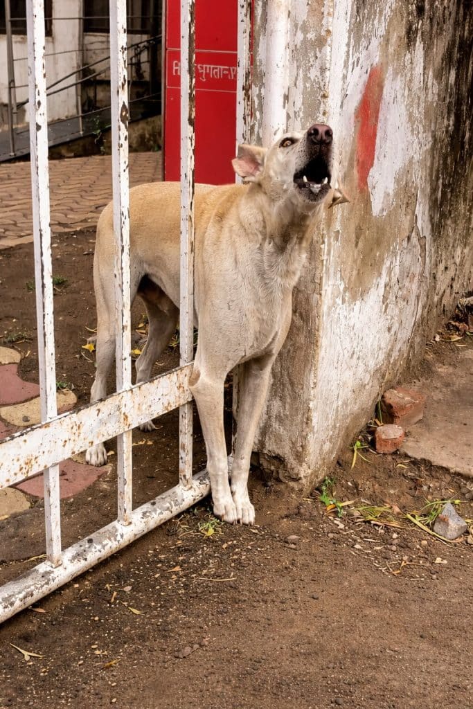 A white dog is wedged tightly between two iron bars of a white gate. His midsection is stuck, unable to move forward or backward. The more he struggles, the more frightened he becomes.