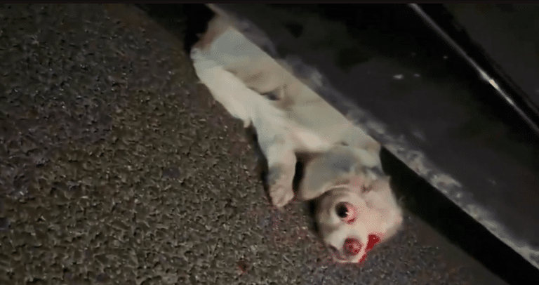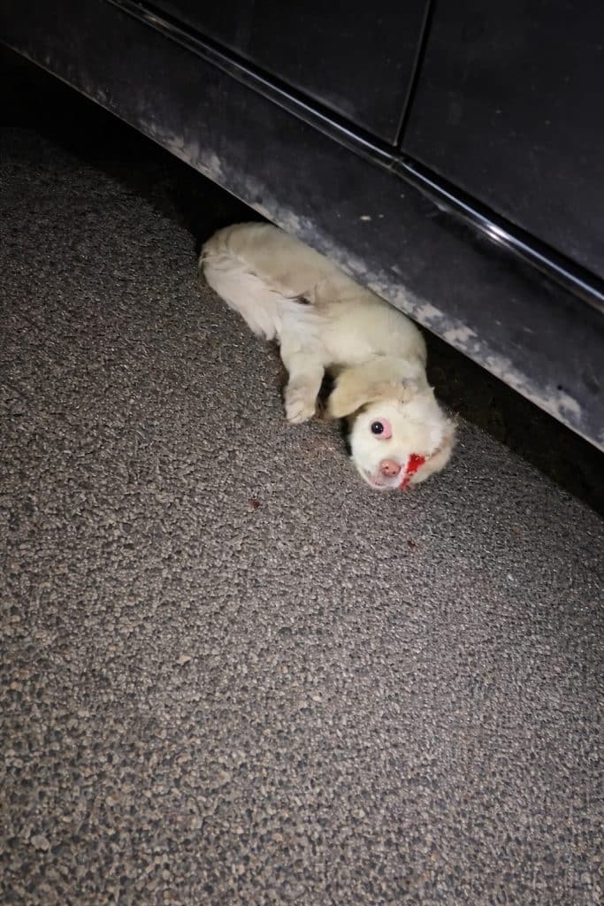 His body is pressed tightly against the pavement, trying to make himself invisible. One eye is severely injured, fresh blood still visible. He doesn’t bark. He doesn’t cry loudly.