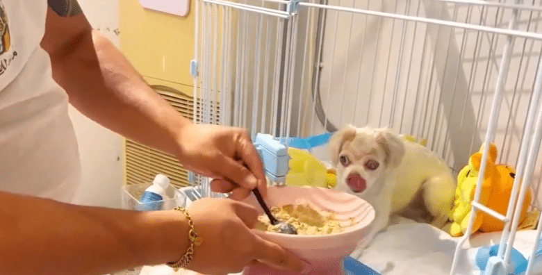 Without full sight, he relied on scent and sound. He sniffed carefully to locate food, used his tongue to explore space, and confidently ate generous bites once he found his bowl.