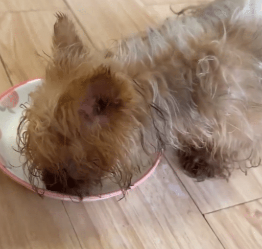 He cooked fresh meat and prepared puppy formula milk to rebuild her strength. YoYo devoured every meal, licking the bowl clean.
