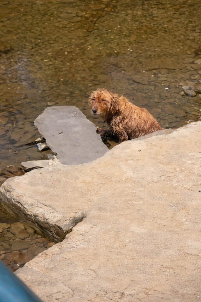 A Golden dog stands half-submerged in an icy stream, surrounded by rough stones and rushing water. He isn’t playing or cooling off. He is still — almost frozen in place.