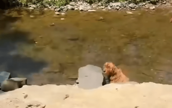 When the rescuer carefully lifts him from the water, the reality becomes painfully clear: his two back legs are completely paralyzed. On the rocky riverbank, he can only drag himself forward using his front legs, scraping across the uneven stones.