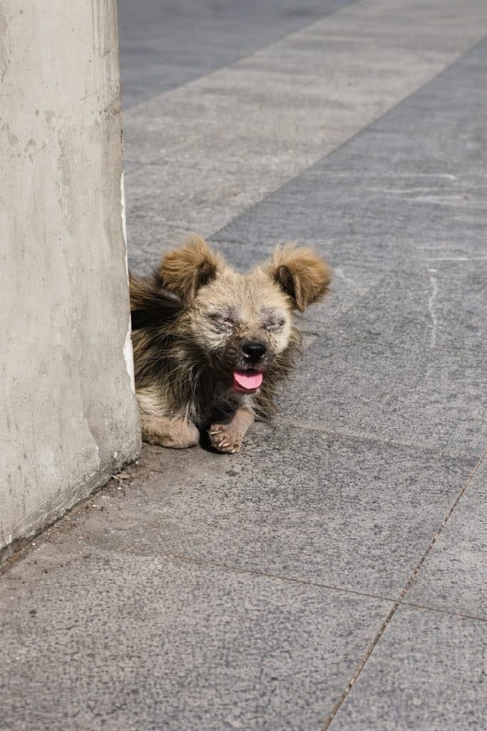 Up close, it becomes clear this is not just a stray resting in the shade. This is a life in urgent need of intervention.