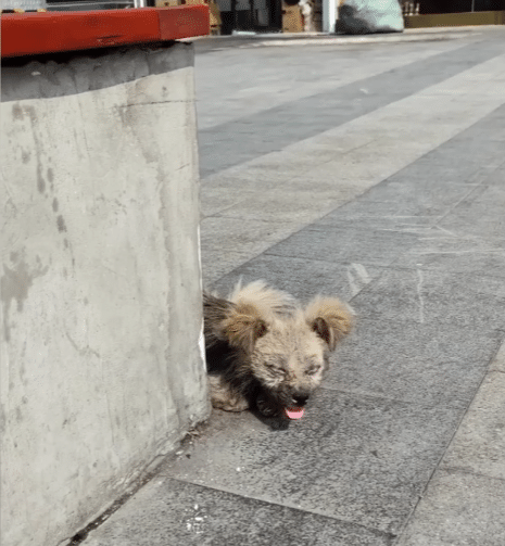 His fur is dirty and matted, damp from dust and grime. But what hurts most to see are his eyes — swollen shut, crusted over with thick discharge. They barely open, if at all.