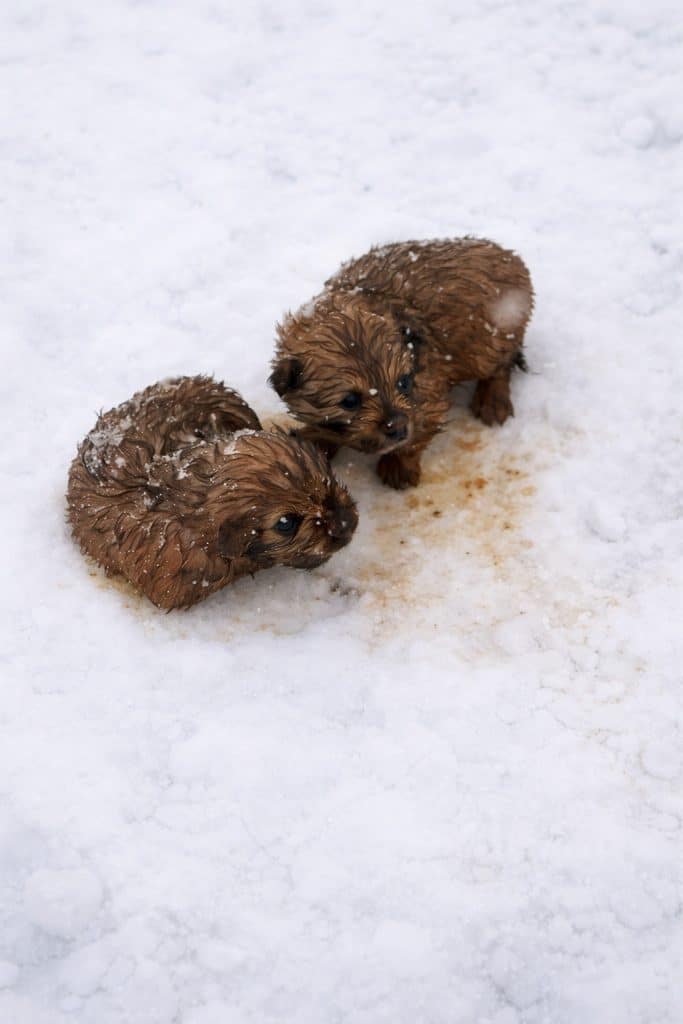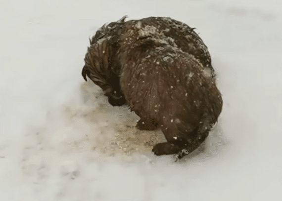 When they stepped closer, they realized the shapes were two tiny puppies — soaked, trembling, and nearly buried under falling snow. Their cries were faint. Their bodies stiff from cold.