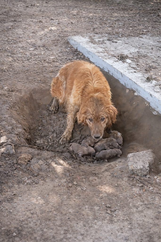 A Golden Retriever lies in a muddy pit, the ground soaked and uneven. Around her, tiny newborn puppies press against her body, their fur already stained with dirt. They are only days old — eyes still closed, unaware of the world beyond their small circle of warmth.