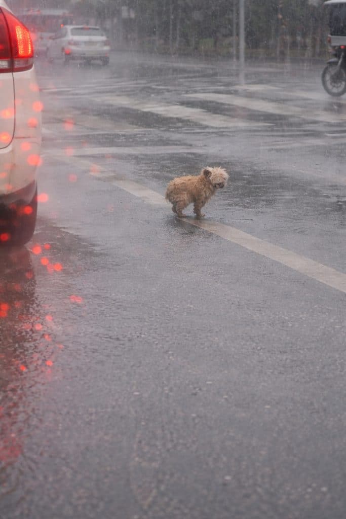It was a crowded highway on a rainy day when a small Poodle was left behind.