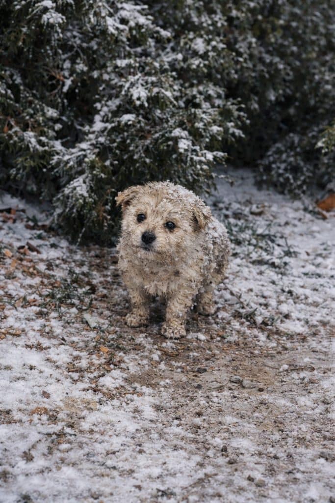 Beneath a tree, barely visible against the snow, sat a tiny puppy.
