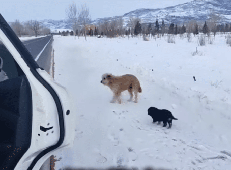 Snow blanketed the ground, the air sharp and unforgiving. In the distance, a stray mother dog approached a parked car where strangers were sitting inside.