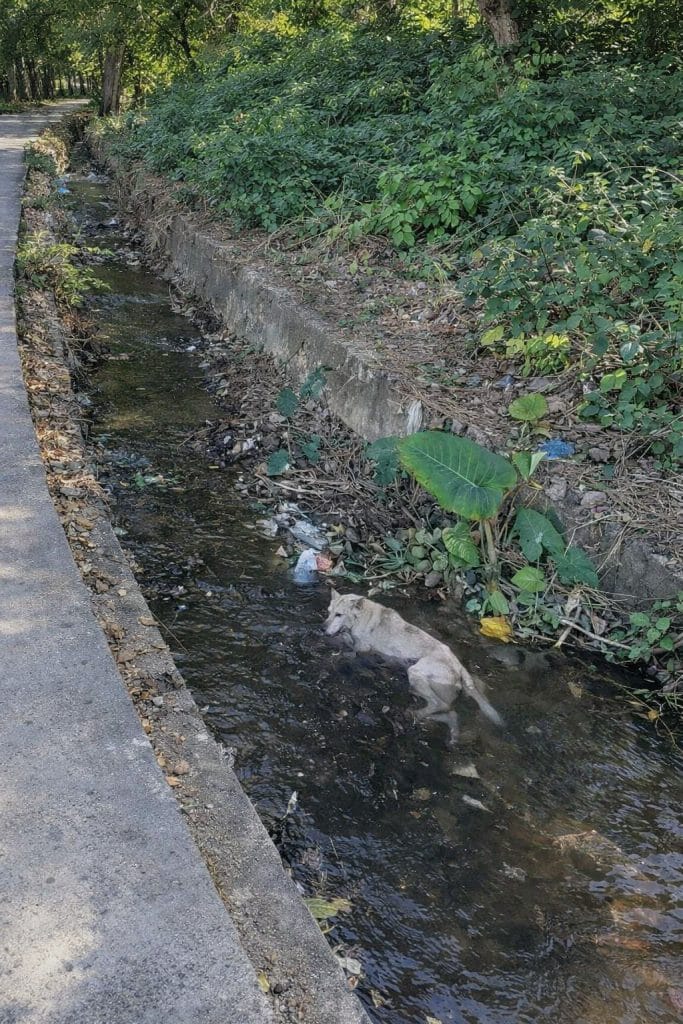 The same dog who had stood silently in a trash-filled ditch was now clean, fed, and safe. He lay comfortably while someone gently petted him. His body was still thin. His recovery was still in progress.