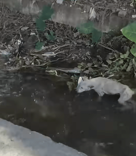 A small cream-colored dog stood quietly in shallow, polluted water, surrounded by scattered trash and drifting debris. His thin body trembled as he tried to steady himself. Every rib was visible beneath his damp fur. He looked exhausted — not just physically, but emotionally.
