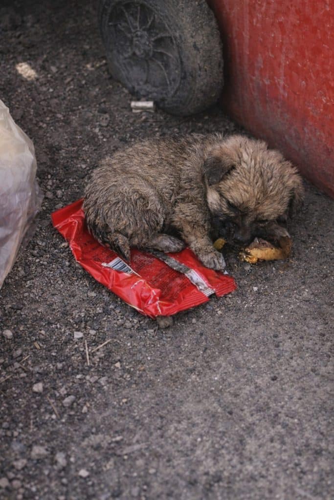 When the video first begins, the puppy is seen digging carefully through waste, sniffing and pawing at what others had thrown away. There is no aggression. No barking.