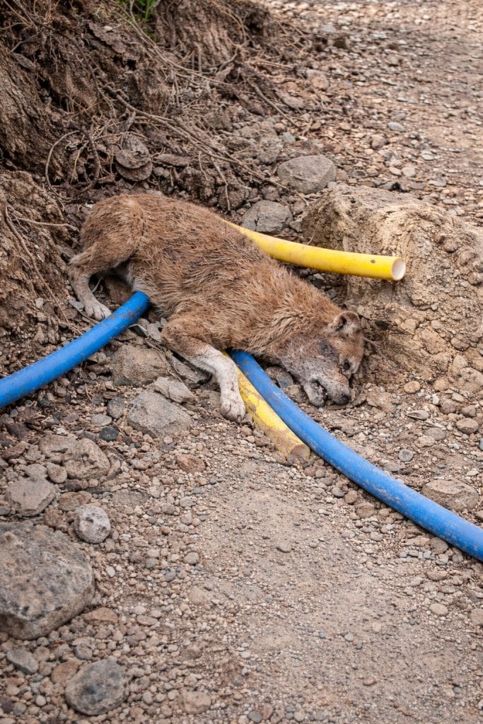 At first glance, she appeared lifeless. Her body lay twisted slightly on its side, fur matted, limbs unmoving. There was no visible struggle — no attempt to stand, no effort to run.