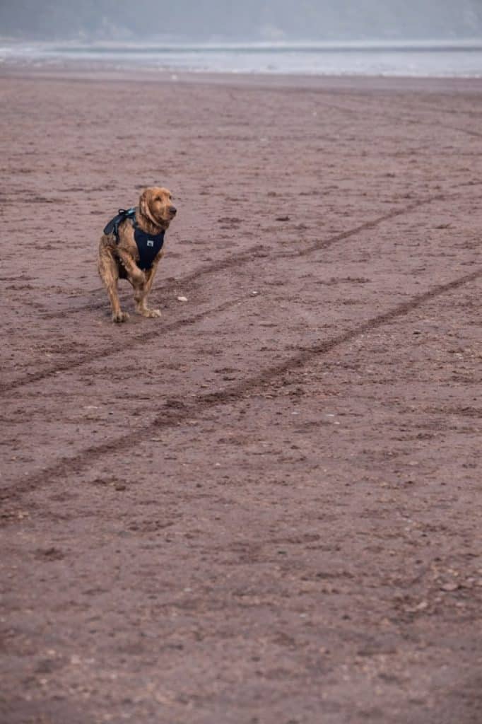 Teddy walking along the shore.