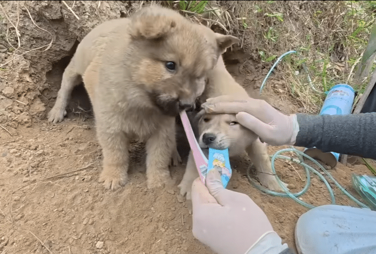 The standing puppy was weak himself — thin, unsteady, clearly undernourished. Yet he wasn’t focused on his own hunger.