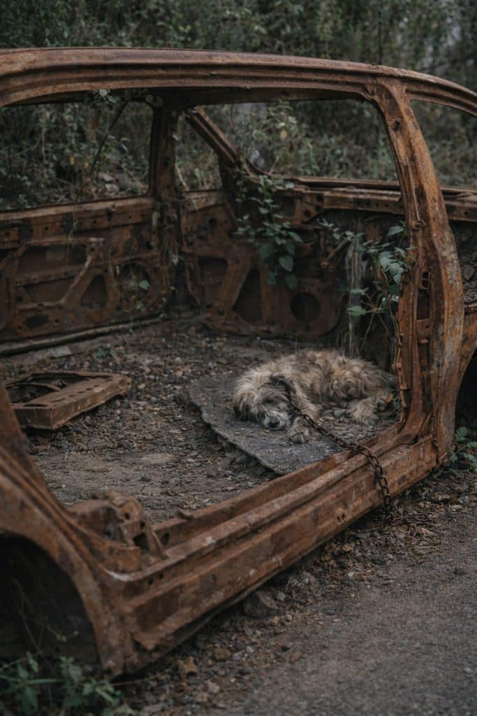 On the side of a small road sat an old, broken vehicle — its metal rusted, its windows clouded with dust, its doors barely hanging on.