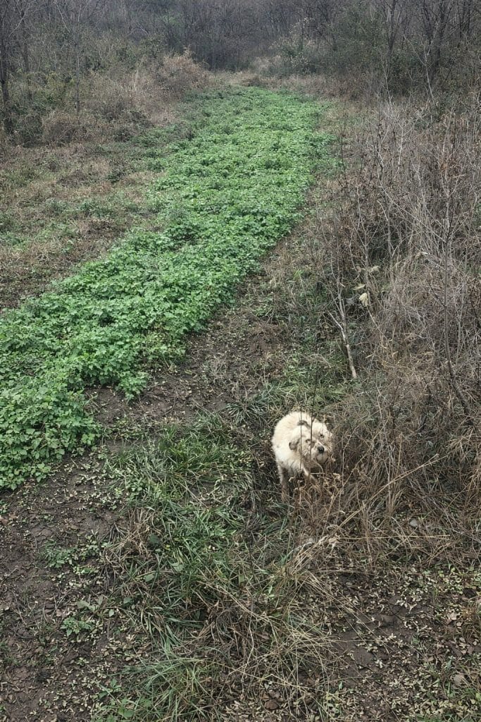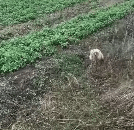 A woman walking nearby paused when she saw movement in the grass. Instead of passing by, she knelt down slowly, careful not to startle the timid dog.