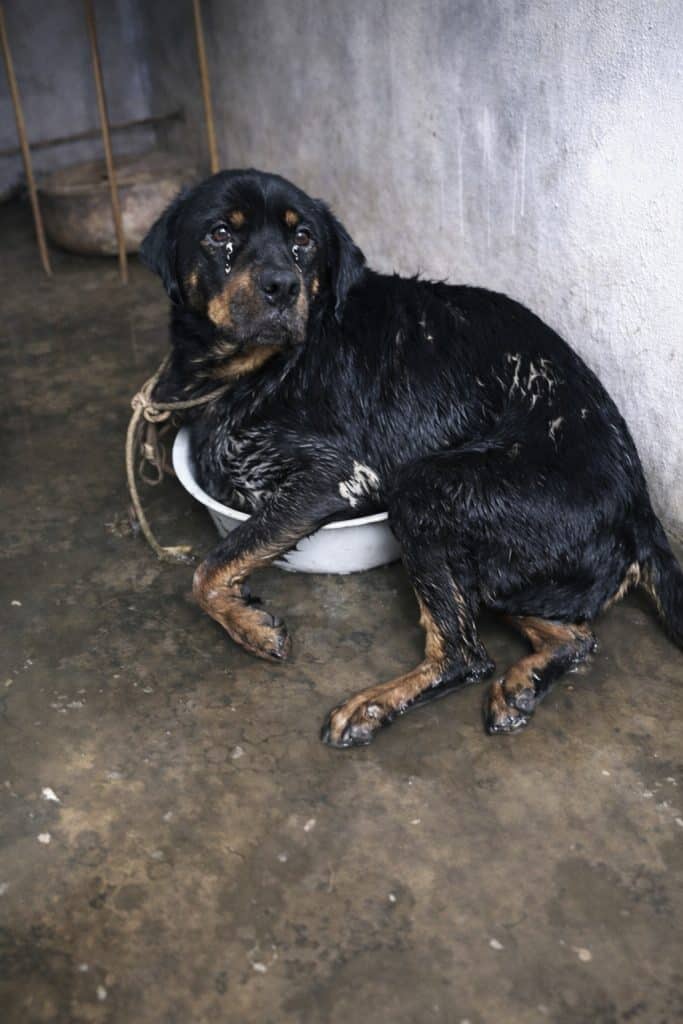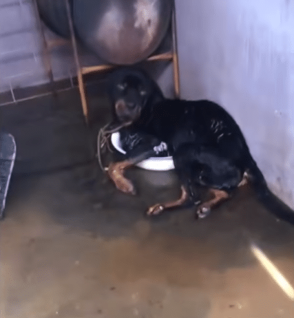 Inside a flooded room, a black dog lay exhausted in cold water, still tied to a chain. The water had surrounded him for nearly two days.