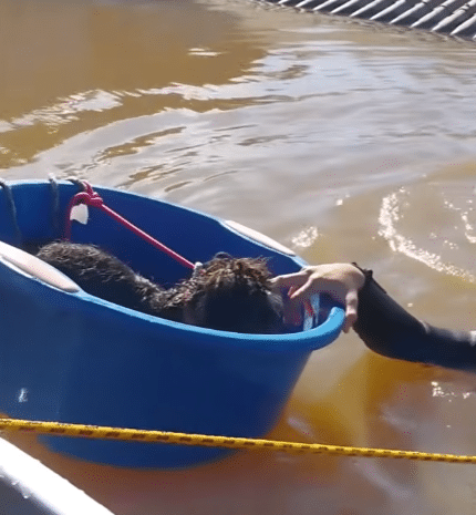 One volunteer stood chest-deep in murky water, guiding a small blue plastic basin across the current. Inside the basin sat a tiny dog, trembling but safe as it was pulled toward the rescue boat.