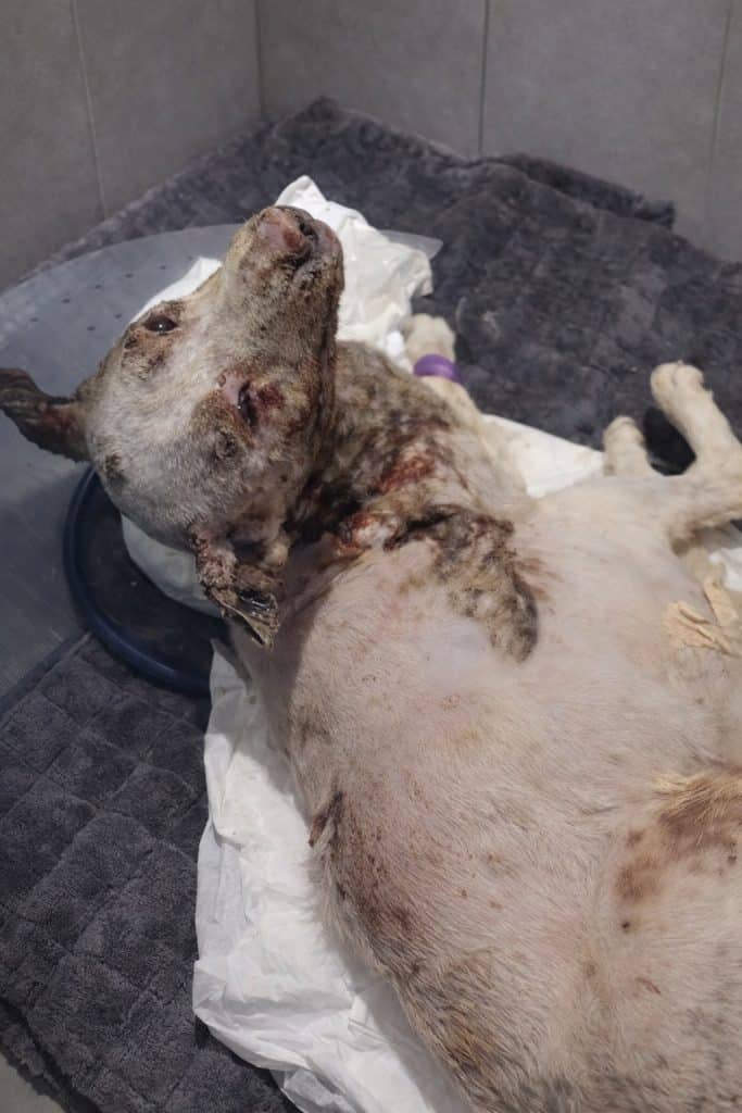 A small dog lies on a treatment table, motionless except for the slow rise and fall of his breathing. His body is fragile, his fur nearly gone, leaving irritated skin exposed and inflamed. Thick crusts cover parts of his head and ears, evidence of a condition that had gone untreated for far too long.