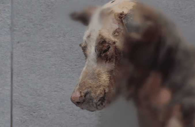 His eyes appear distant, exhausted from days — perhaps weeks — of discomfort and neglect.