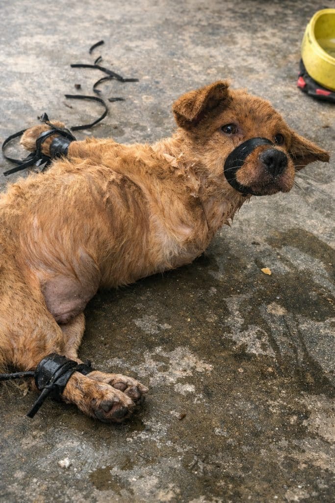 The dog had been tied again — his muzzle bound, his legs secured tightly to a piece of wood on the damp floor. He lay there unable to move, trembling with fear.