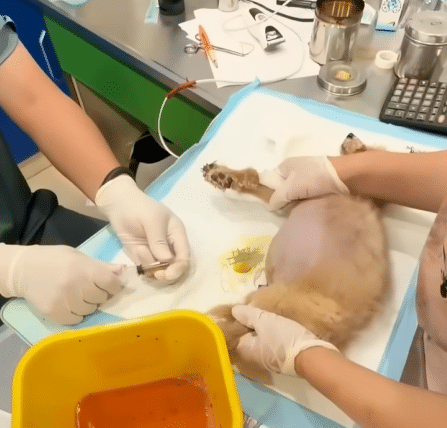 At the clinic, the veterinarians quickly began examining him.