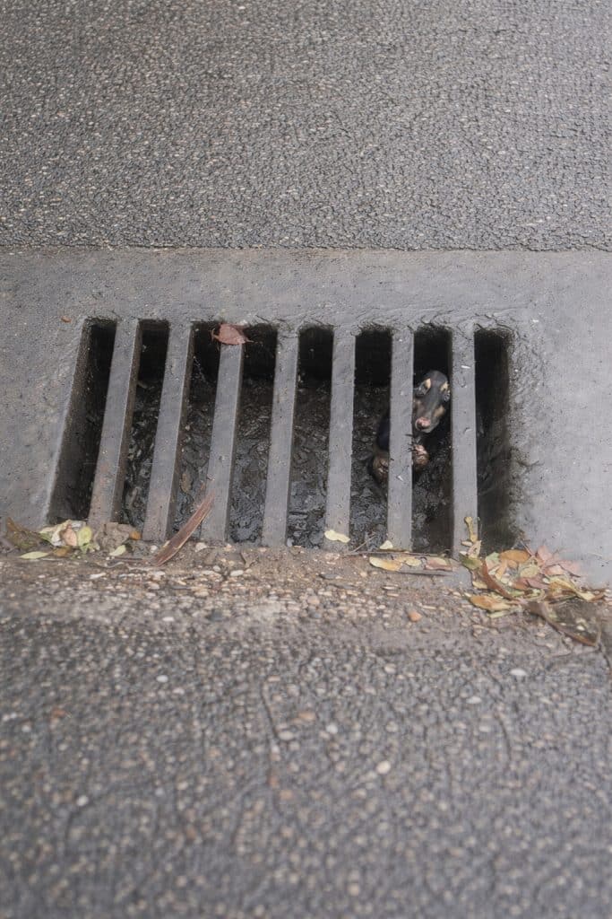 At the bottom of the manhole, the small dog sat pressed against the wall.