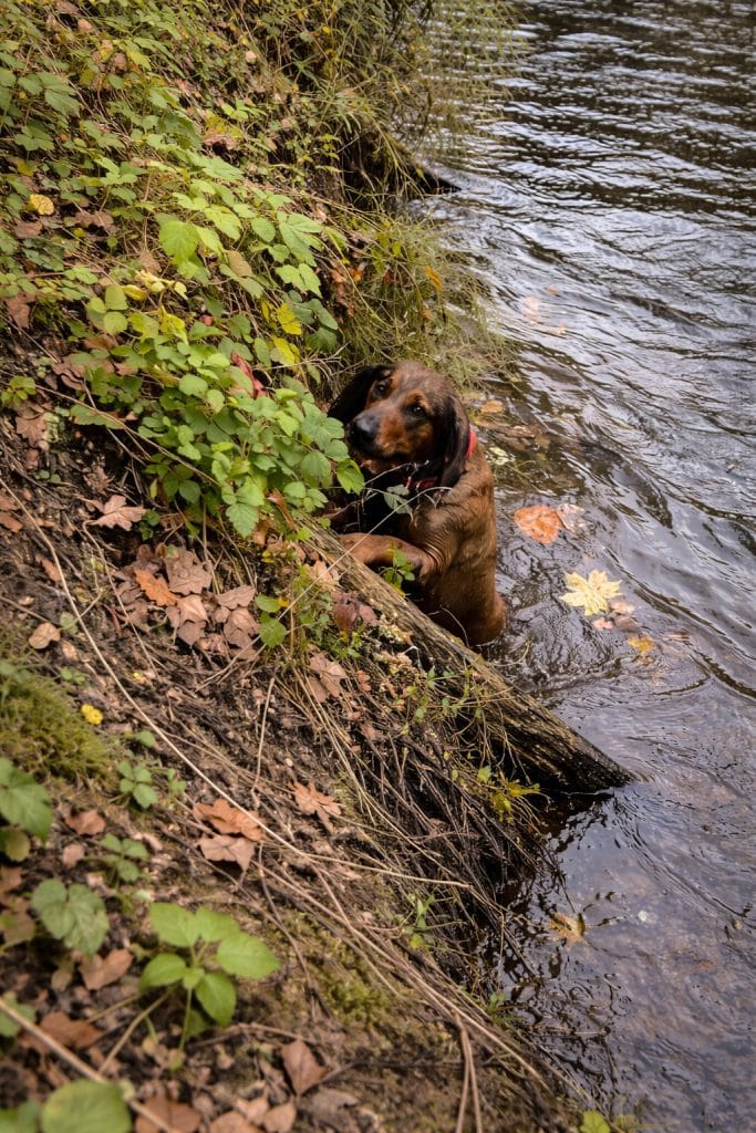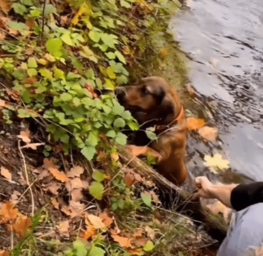 With effort, he lifted the tired dog and guided him safely back onto land.