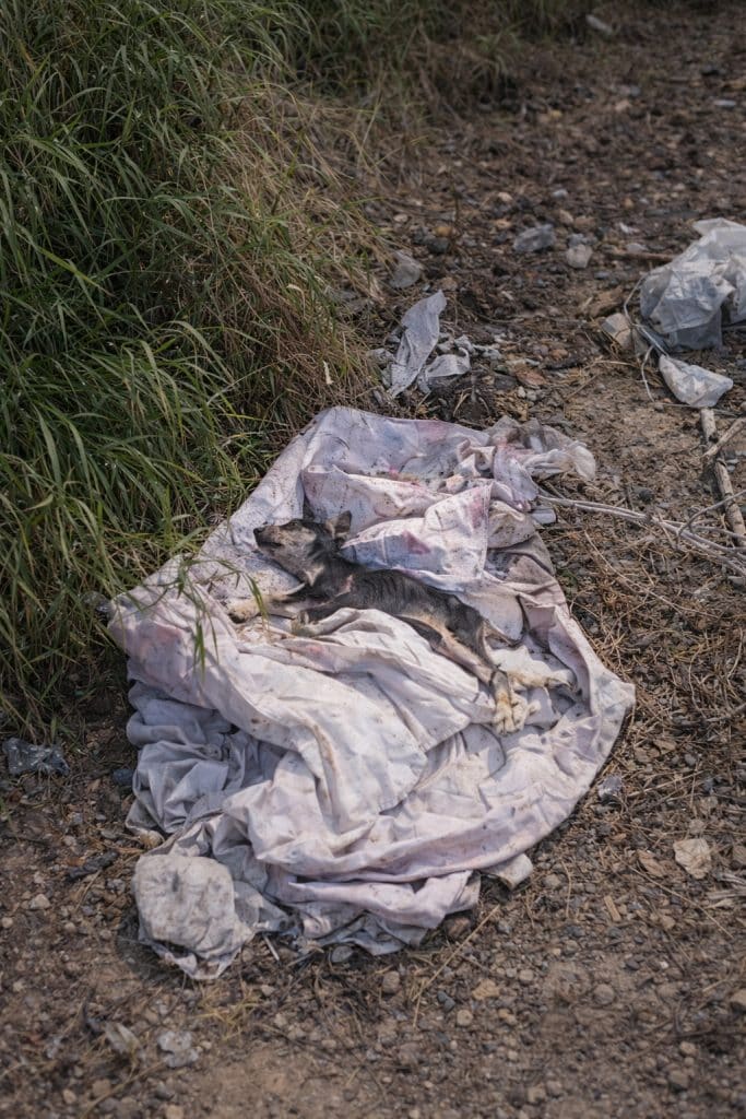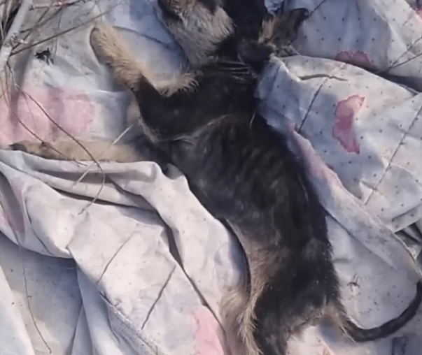 At first, it was hard to understand what the rescuer was seeing. Among scattered trash and debris, a tiny dog lay curled on the ground. She was so small that she almost disappeared against the background.