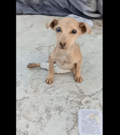 One of the dog’s legs was badly injured and tied with a piece of cloth, as if someone had attempted a rough bandage — and then simply walked away.