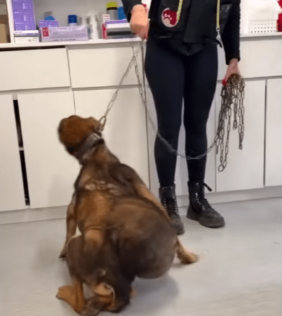 When rescuers finally arrived, the reality was even more heartbreaking than the reports had described. Exalux was still chained in the yard, the thick metal chain wrapped tightly around his neck.