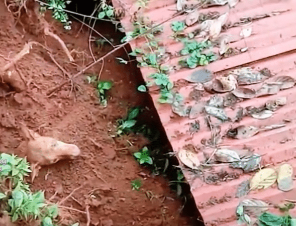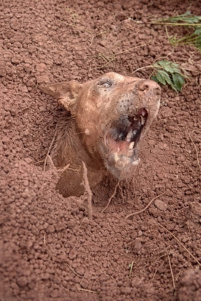 As the soil cleared away, the rescuer discovered a brown mother dog buried almost completely under the landslide.