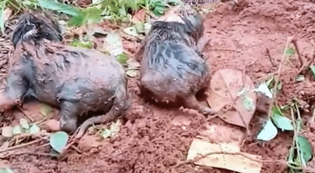 The puppies were weak and shaking, their tiny bodies covered in dirt. The mother dog struggled to stand, her strength nearly gone after two days beneath the soil.