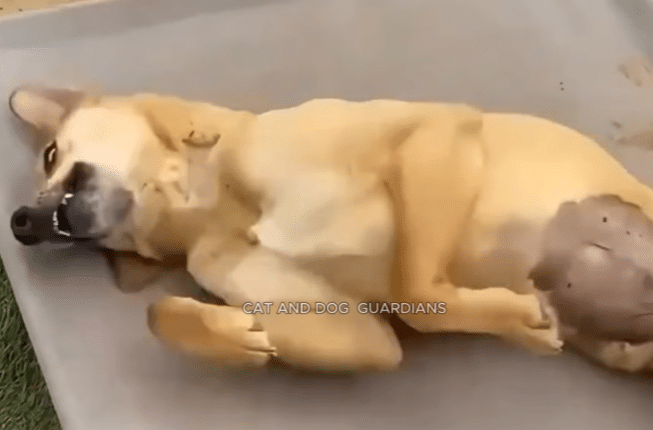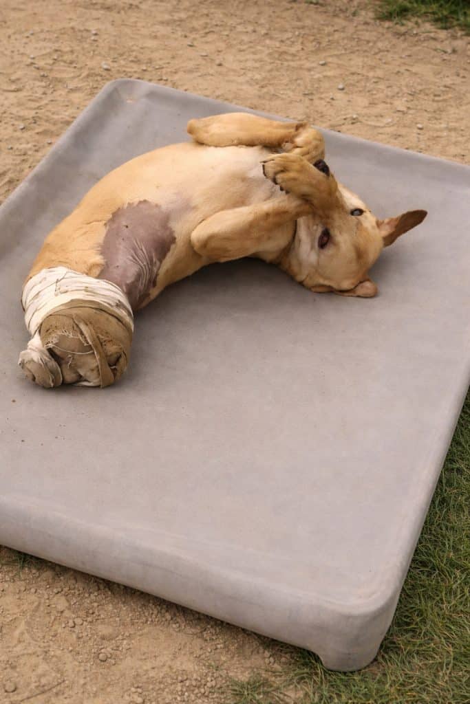 He lay quietly among debris, barely moving. His back legs had been wrapped roughly with torn pieces of cloth. His body had grown thin from days without care, and exhaustion had taken hold.