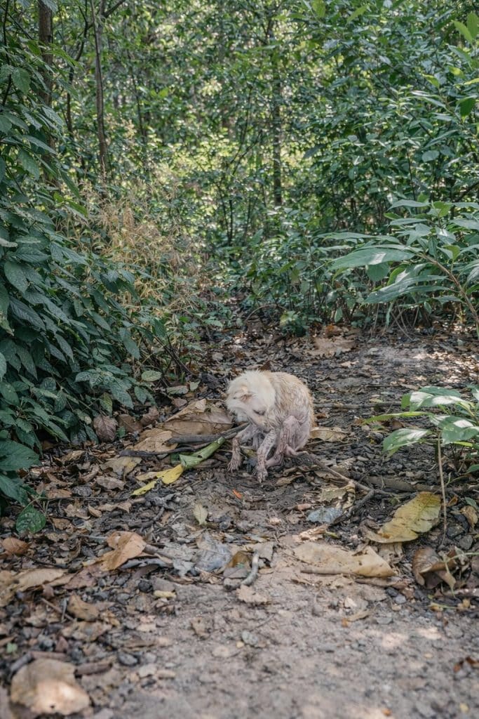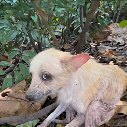 His body was dangerously thin — ribs pressing sharply beneath his skin. Most of his fur had fallen out due to severe skin disease, leaving irritated patches exposed to the cold and moisture of the forest floor.
