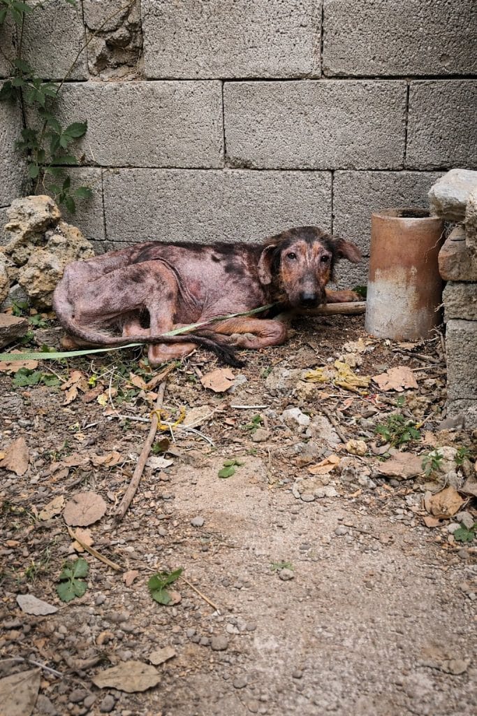 The dog’s body had grown painfully thin, his ribs clearly visible beneath fragile skin. Severe mange had spread across his body, causing most of his fur to fall out. The exposed skin underneath looked irritated and inflamed, and infection had taken hold.