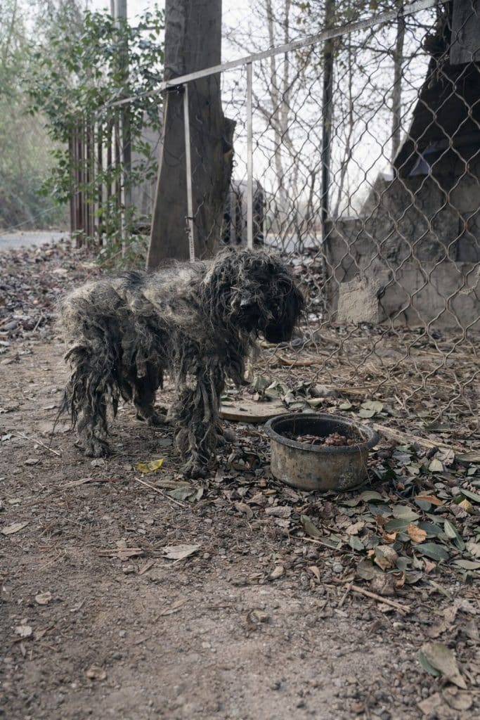 His coat had grown into thick, tangled mats that resembled stiff clumps of fabric. The fur had hardened into layers that restricted his movement and pulled against his skin.