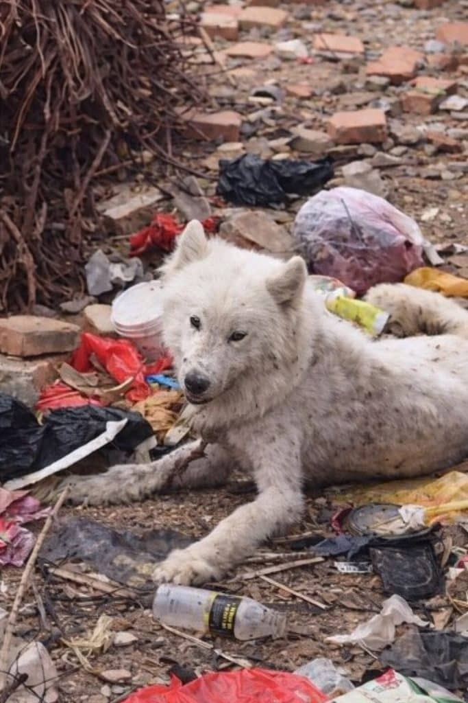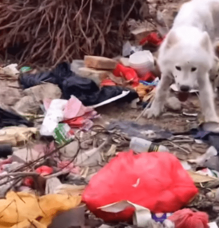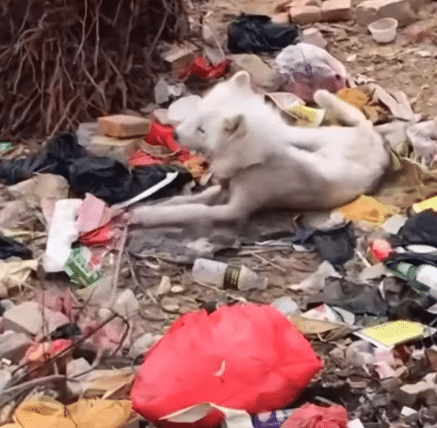 Under a blazing sun that pushed temperatures close to 42°C (107°F), a small white dog lay barely moving beside a pile of trash. Flies hovered around him, and the ground beneath his body radiated heat from the pavement.