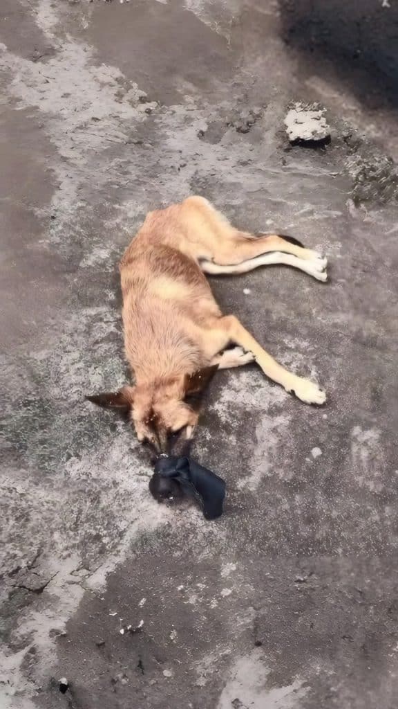 When the neighbors opened the bag, they found a tiny dog curled inside the torn fabric. Her body was weak and exhausted, and she barely had the strength to lift her head.