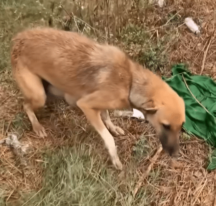 On a patch of abandoned land scattered with broken bricks and piles of trash, a thin mother dog wandered slowly, searching for something to eat. Her body looked tired, but she kept moving with determination.