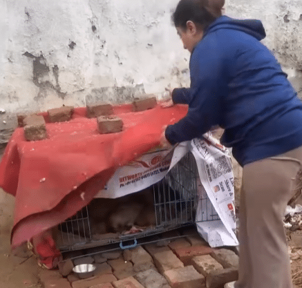 First, she placed the metal crate on top of several red bricks to lift it off the cold, damp ground. This small step would keep the puppies warmer and protect them from moisture.