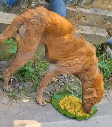 At one stop, a thin black dog with severe hair loss lowers his head immediately and begins eating eagerly. His ribs are visible beneath his skin, a sign of how long he has been struggling.