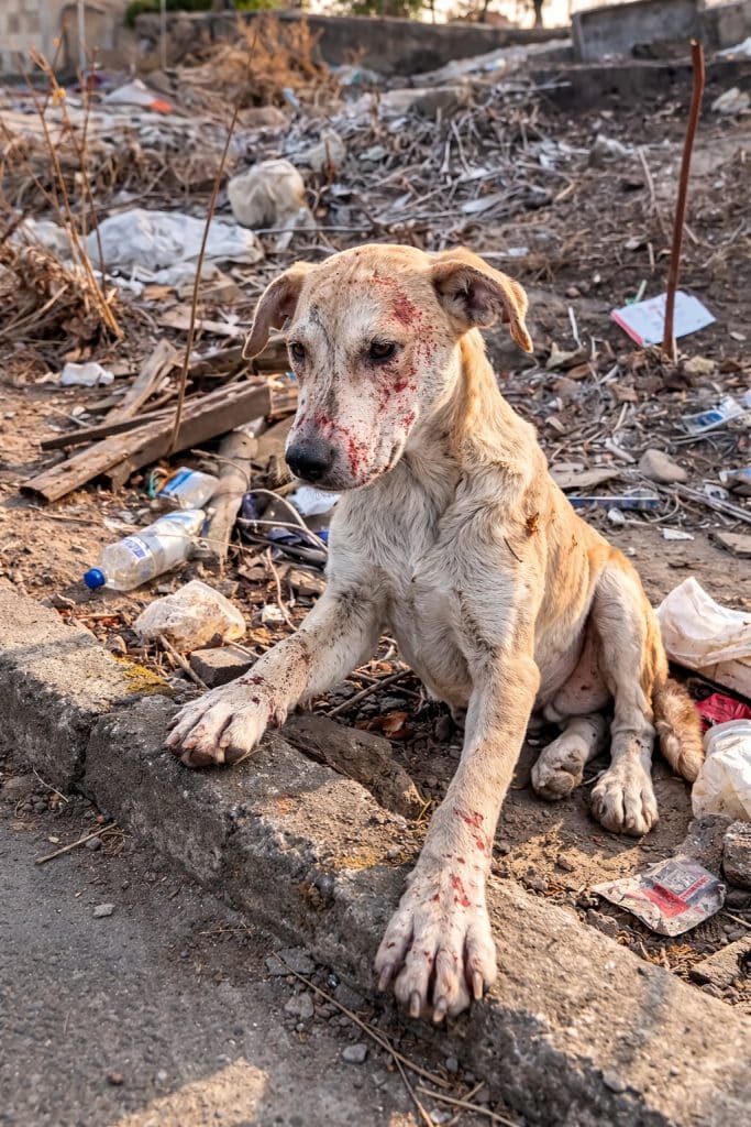 His coat is matted with dirt, and his body is noticeably thin. There is no food bowl, no shelter, and no sign that anyone regularly comes to care for him.