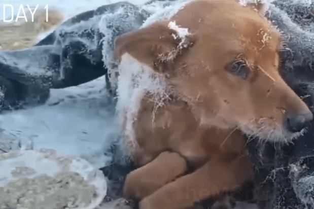 One of his back legs had a severe wound that exposed bone and tissue, and blood had frozen around the injury. His body was painfully thin, showing clear signs of long-term starvation.